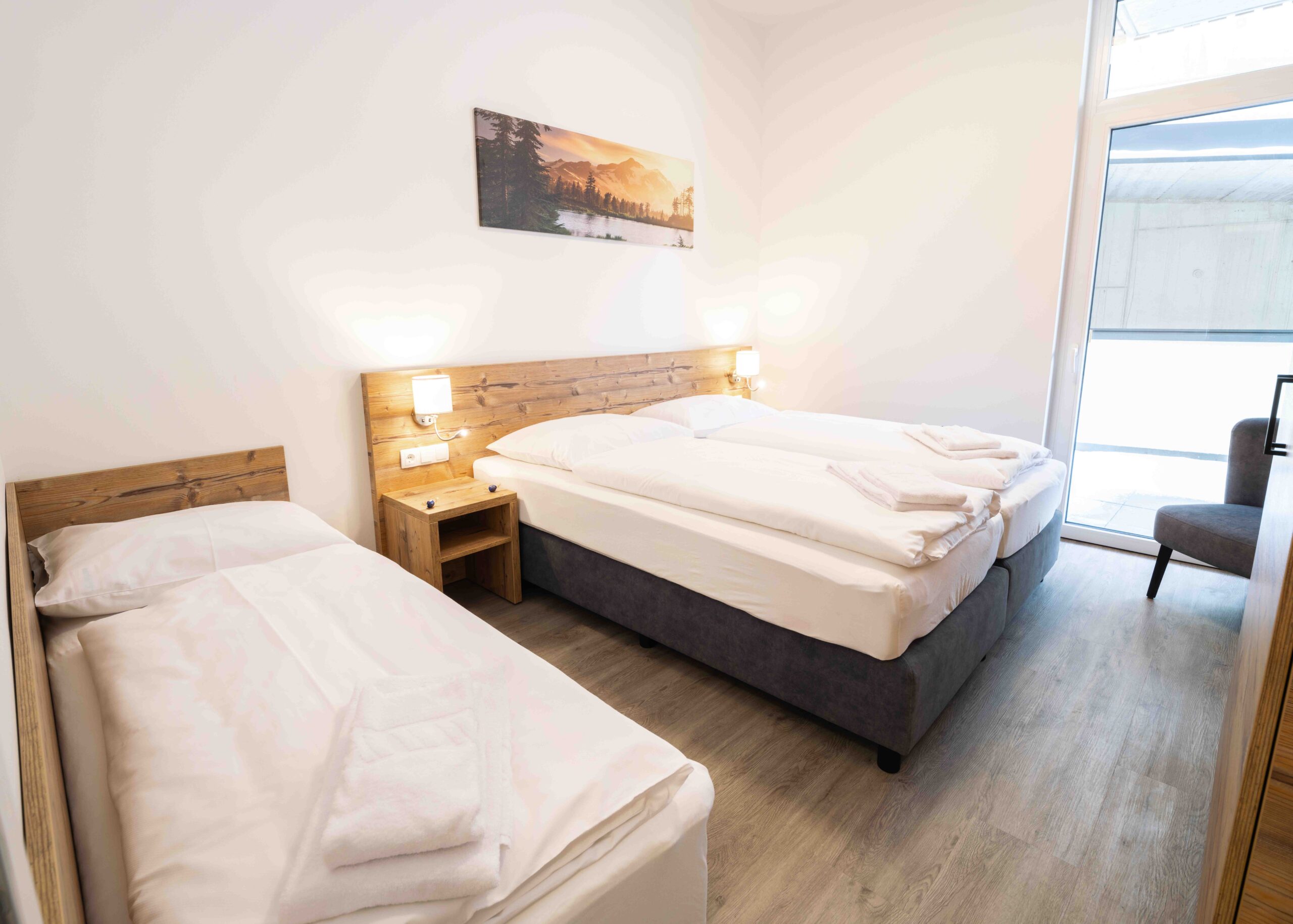 Die Raumaufteilung ist wie folgt: 1. Schlafzimmer mit einem Doppelbett und Bad, 2. Schlafzimmer mit einem Doppelbett und 2 Einzelbetten mit Bad, ein weiteres Doppelbett befindet sich in einem abgetrennten Bereich des Wohnzimmers. Die Küche ist komplett ausgestattet, eine Fußbodenheizung sorgt für angenehme Wärme.