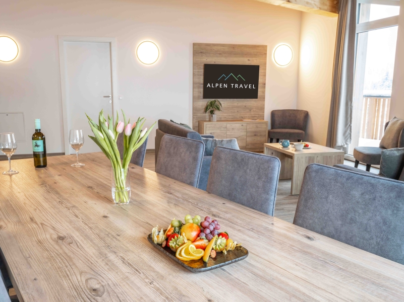 Der große Wohn- Essraum mit der integrierten Küche bildet das Zentrum des Apartments. Hier ist Platz für alle, für gemütliche Abende mit der Familie oder mit Freunden.